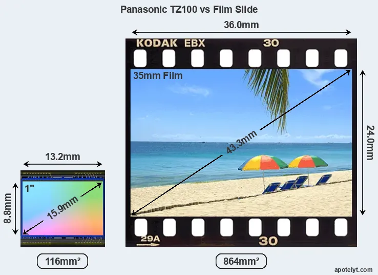 The Panasonic Lumix DMC-TZ100 is equipped with an one-inch sensor, whose diagonal measures 15.9mm. The sensor has a crop factor (or format factor, or focal length multiplier) of 2.7.