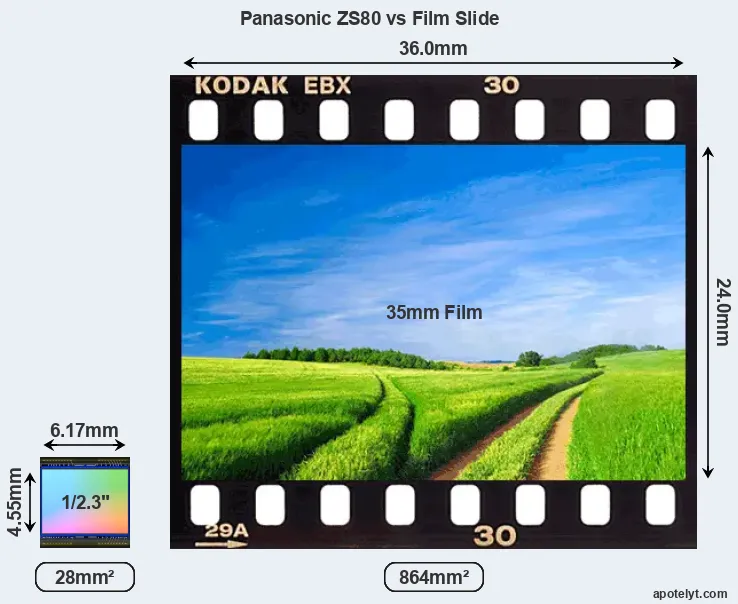 The Panasonic Lumix DC-ZS80 is a digital camera that has a 1/2.3-inch sensor at its core. This imager measures 6.17mm in width and 4.55mm in height, so that the total imaging area of the sensor amounts to 28 mm2.