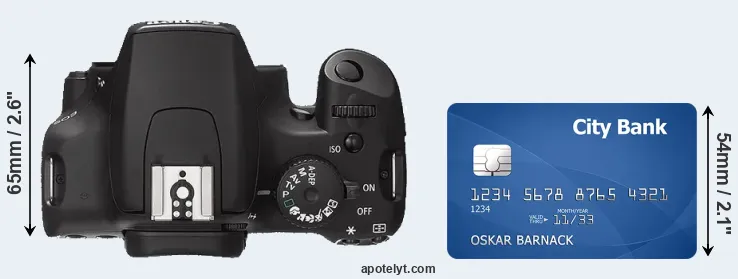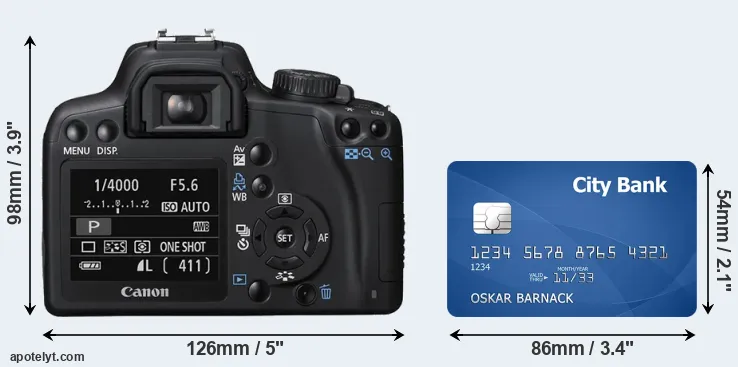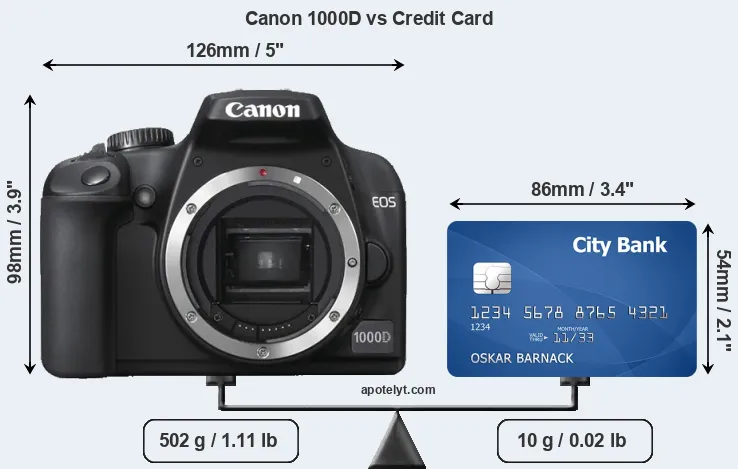 An illustration of the physical dimensions of the Canon 1000D vis-à-vis a credit card is provided in the side-by-side display below. Three successive views from the front, the top, and the rear are shown. All width, height and depth dimensions are rounded to the nearest millimeter.