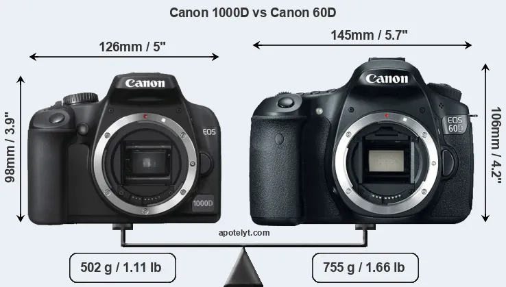 If the front view area (width x height) of the cameras is taken as an aggregate measure of their size, the Canon 60D is notably larger (24 percent) than the Canon 1000D. Moreover, the 60D is substantially heavier (50 percent) than the 1000D. It is noteworthy in this context that the 60D is splash and dust-proof, while the 1000D does not feature any corresponding weather-sealing.