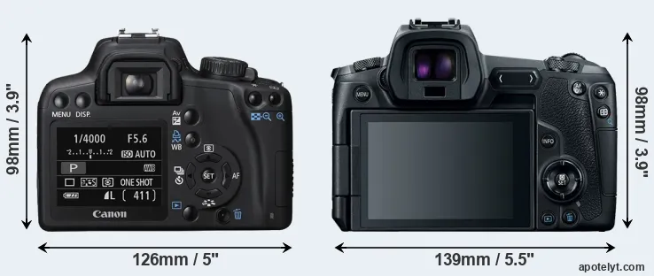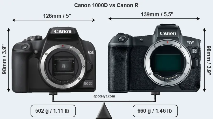 If the front view area (width x height) of the cameras is taken as an aggregate measure of their size, the Canon R is notably larger (10 percent) than the Canon 1000D. Moreover, the Canon R is markedly heavier (31 percent) than the 1000D. It is noteworthy in this context that the Canon R is splash and dust-proof, while the 1000D does not feature any corresponding weather-sealing.