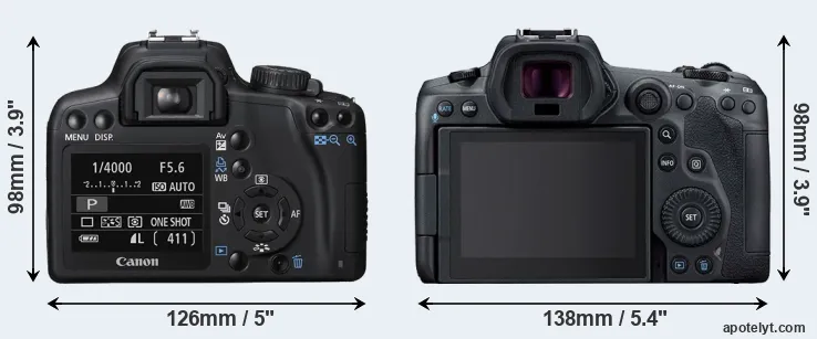 If the front view area (width x height) of the cameras is taken as an aggregate measure of their size, the Canon R5 is notably larger (10 percent) than the Canon 1000D. Moreover, the R5 is substantially heavier (47 percent) than the 1000D. It is noteworthy in this context that the R5 is splash and dust-proof, while the 1000D does not feature any corresponding weather-sealing.