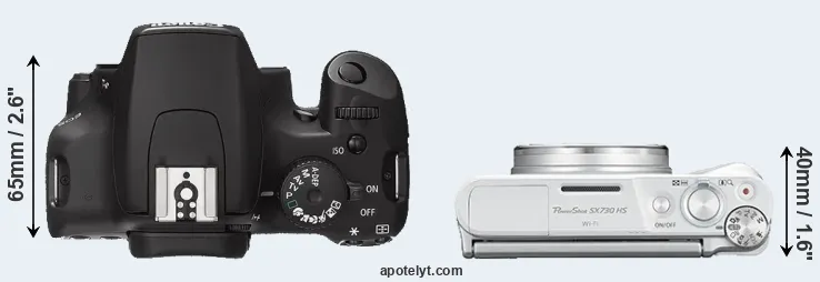 The side-by-side display below illustrates the physical size and weight of the Canon 1000D and the Canon SX730. The two cameras are presented according to their relative size. Three consecutive views from the front, the top, and the rear side are shown. All width, height and depth dimensions are rounded to the nearest millimeter.