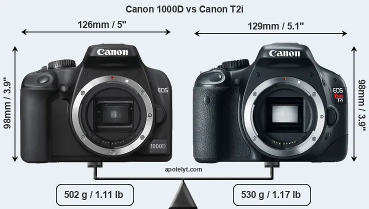 The side-by-side display below illustrates the physical size and weight of the Canon 1000D and the Canon T2i. The two cameras are presented according to their relative size. Three consecutive perspectives from the front, the top, and the back are available. All width, height and depth measures are rounded to the nearest millimeter.