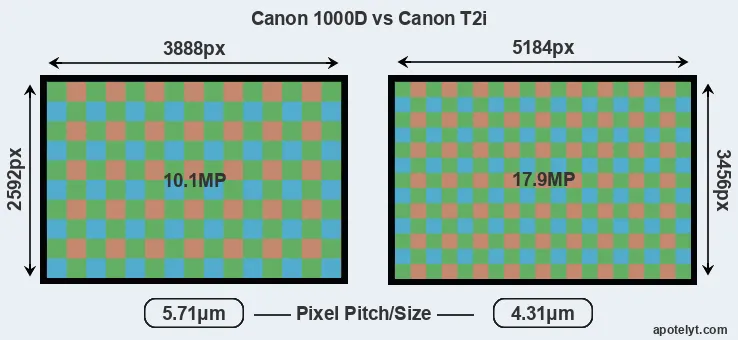 With 17.9MP, the T2i offers a higher resolution than the 1000D (10.1MP), but the T2i has smaller individual pixels (pixel pitch of 4.31μm versus 5.71μm for the 1000D). Yet, the T2i is a somewhat more recent model (by 1 year and 7 months) than the 1000D, and its sensor might have benefitted from technological advances during this time that enhance the light gathering capacity of its pixel-units.