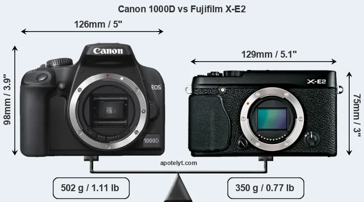 The physical size and weight of the Canon 1000D and the Fujifilm X-E2 are illustrated in the side-by-side display below. The two cameras are presented according to their relative size. Three consecutive views from the front, the top, and the rear side are shown. All width, height and depth dimensions are rounded to the nearest millimeter.