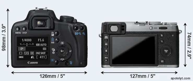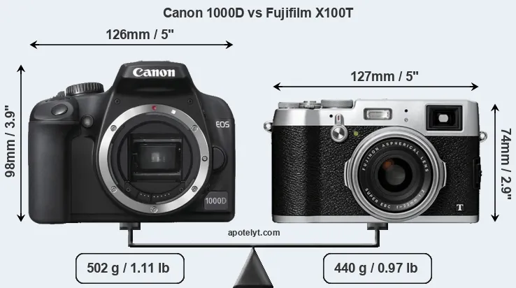 The physical size and weight of the Canon 1000D and the Fujifilm X100T are illustrated in the side-by-side display below. The two cameras are presented according to their relative size. Three consecutive perspectives from the front, the top, and the back are available. All width, height and depth dimensions are rounded to the nearest millimeter.