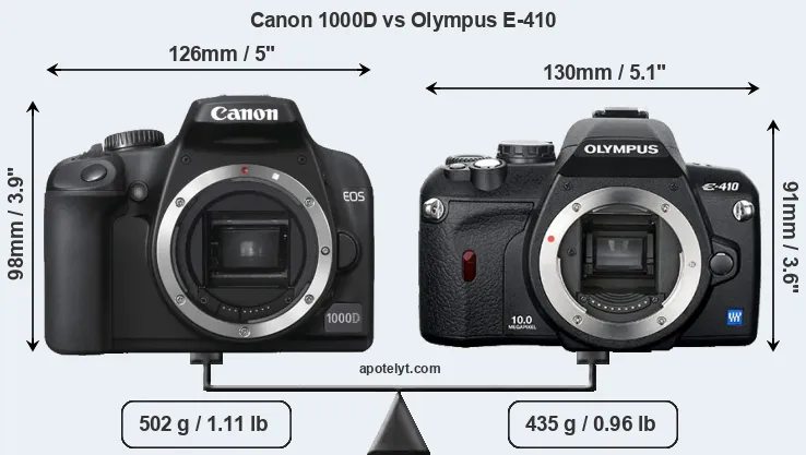 An illustration of the physical size and weight of the Canon 1000D and the Olympus E-410 is provided in the side-by-side display below. The two cameras are presented according to their relative size. Three successive views from the front, the top, and the rear are shown. All width, height and depth measures are rounded to the nearest millimeter.