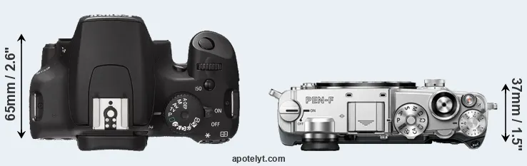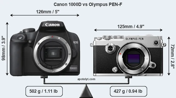 The physical size and weight of the Canon 1000D and the Olympus PEN-F are illustrated in the side-by-side display below. The two cameras are presented according to their relative size. Three consecutive views from the front, the top, and the rear side are shown. All width, height and depth measures are rounded to the nearest millimeter.