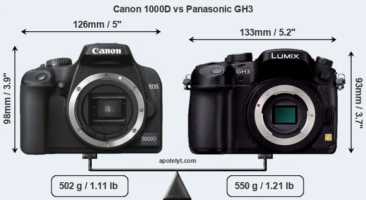 The physical size and weight of the Canon 1000D and the Panasonic GH3 are illustrated in the side-by-side display below. The two cameras are presented according to their relative size. Three successive views from the front, the top, and the rear are shown. All width, height and depth measures are rounded to the nearest millimeter.