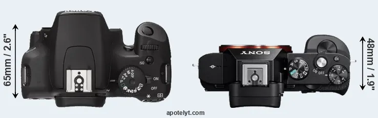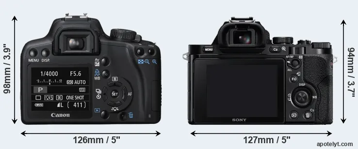 The physical size and weight of the Canon 1000D and the Sony A7 are illustrated in the side-by-side display below. The two cameras are presented according to their relative size. Three consecutive perspectives from the front, the top, and the back are available. All width, height and depth dimensions are rounded to the nearest millimeter.