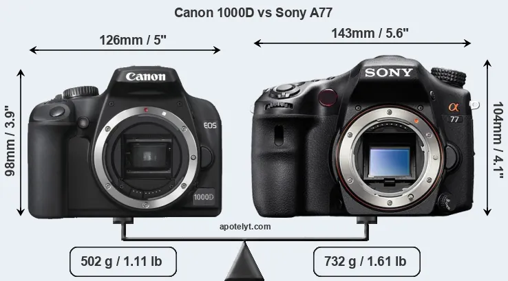 If the front view area (width x height) of the cameras is taken as an aggregate measure of their size, the Sony A77 is notably larger (20 percent) than the Canon 1000D. Moreover, the A77 is substantially heavier (46 percent) than the 1000D. It is noteworthy in this context that the A77 is splash and dust-proof, while the 1000D does not feature any corresponding weather-sealing.