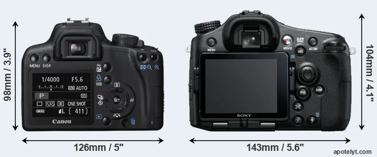 Going beyond this snapshot of core features and characteristics, what are the differences between the Canon EOS 1000D and the Sony Alpha SLT-A77? Which one should you buy? Read on to find out how these two cameras compare with respect to their body size, their imaging sensors, their shooting features, their input-output connections, and their reception by expert reviewers.