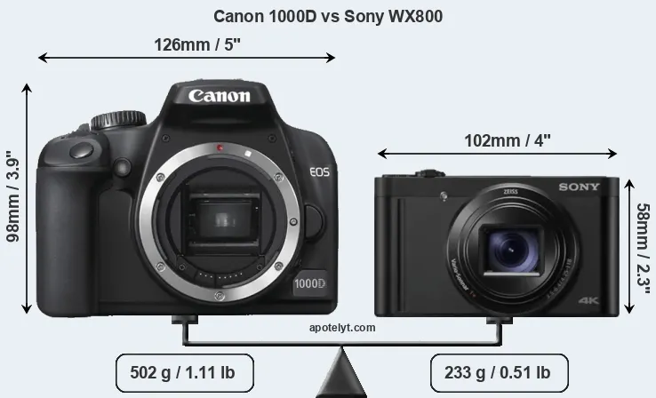 The side-by-side display below illustrates the physical size and weight of the Canon 1000D and the Sony WX800. The two cameras are presented according to their relative size. Three consecutive views from the front, the top, and the rear side are shown. All width, height and depth dimensions are rounded to the nearest millimeter.