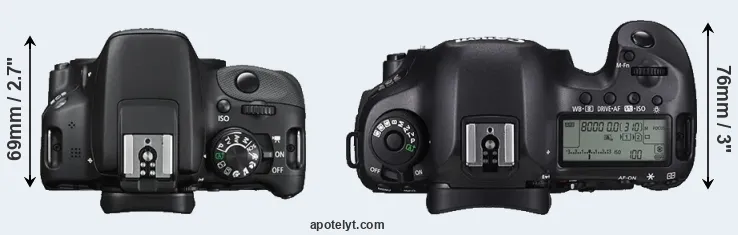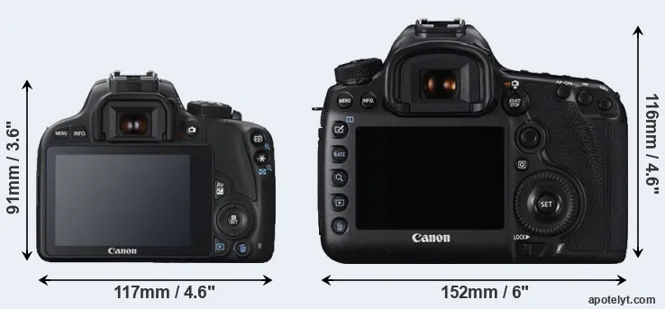 The side-by-side display below illustrates the physical size and weight of the Canon 100D and the Canon 5DS R. The two cameras are presented according to their relative size. Three consecutive perspectives from the front, the top, and the back are available. All width, height and depth dimensions are rounded to the nearest millimeter.