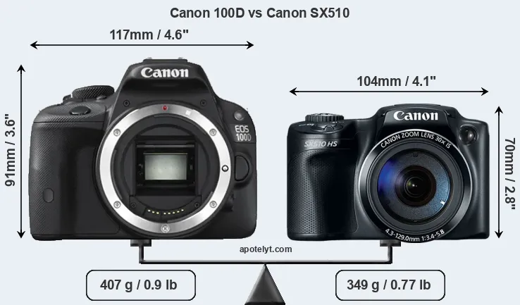 The physical size and weight of the Canon 100D and the Canon SX510 are illustrated in the side-by-side display below. The two cameras are presented according to their relative size. Three successive views from the front, the top, and the rear are shown. All width, height and depth dimensions are rounded to the nearest millimeter.