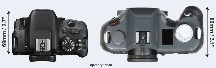 The physical size and weight of the Canon 100D and the Leica S-E Typ 006 are illustrated in the side-by-side display below. The two cameras are presented according to their relative size. Three consecutive perspectives from the front, the top, and the back are available. All width, height and depth measures are rounded to the nearest millimeter.