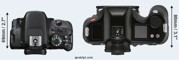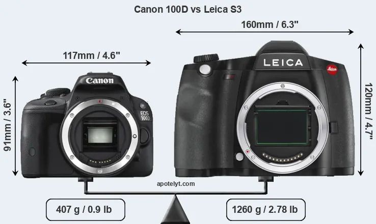 An illustration of the physical size and weight of the Canon 100D and the Leica S3 is provided in the side-by-side display below. The two cameras are presented according to their relative size. Three successive views from the front, the top, and the rear are shown. All width, height and depth measures are rounded to the nearest millimeter.