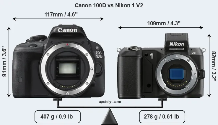 The side-by-side display below illustrates the physical size and weight of the Canon 100D and the Nikon 1 V2. The two cameras are presented according to their relative size. Three successive views from the front, the top, and the rear are shown. All size dimensions are rounded to the nearest millimeter.