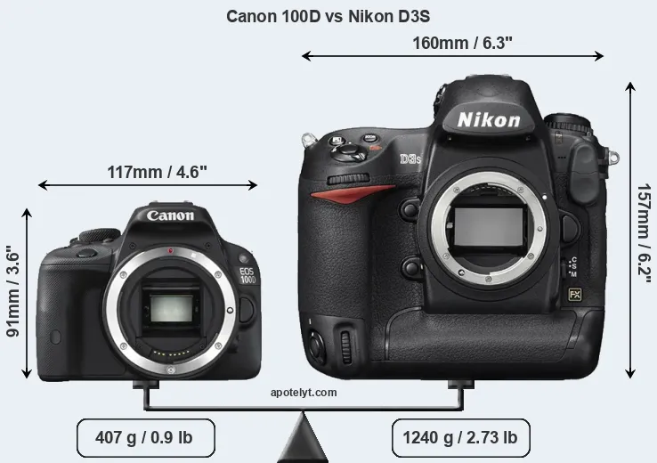 An illustration of the physical size and weight of the Canon 100D and the Nikon D3S is provided in the side-by-side display below. The two cameras are presented according to their relative size. Three consecutive perspectives from the front, the top, and the back are available. All size dimensions are rounded to the nearest millimeter.