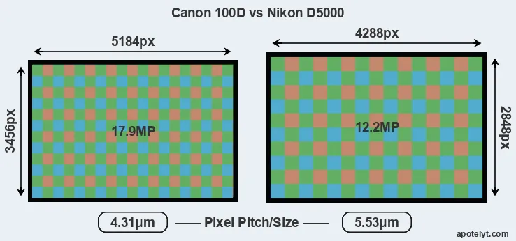 Despite having a smaller sensor, the Canon 100D offers a higher resolution of 17.9 megapixels, compared with 12.2 MP of the Nikon D5000. This megapixels advantage comes at the cost of a higher pixel density and a smaller size of the individual pixel (with a pixel pitch of 4.31μm versus 5.53μm for the D5000). However, it should be noted that the 100D is much more recent (by 3 years and 11 months) than the D5000, and its sensor will have benefitted from technological advances during this time that make it possible to gather light more efficiently.