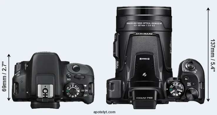 An illustration of the physical size and weight of the Canon 100D and the Nikon P900 is provided in the side-by-side display below. The two cameras are presented according to their relative size. Three consecutive views from the front, the top, and the rear side are shown. All width, height and depth measures are rounded to the nearest millimeter.