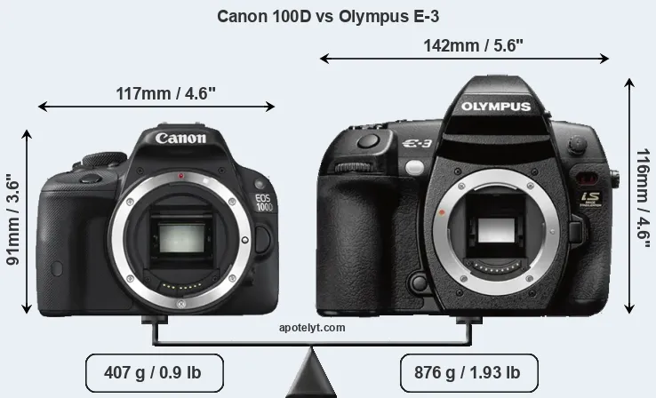 The physical size and weight of the Canon 100D and the Olympus E-3 are illustrated in the side-by-side display below. The two cameras are presented according to their relative size. Three consecutive perspectives from the front, the top, and the back are available. All width, height and depth measures are rounded to the nearest millimeter.