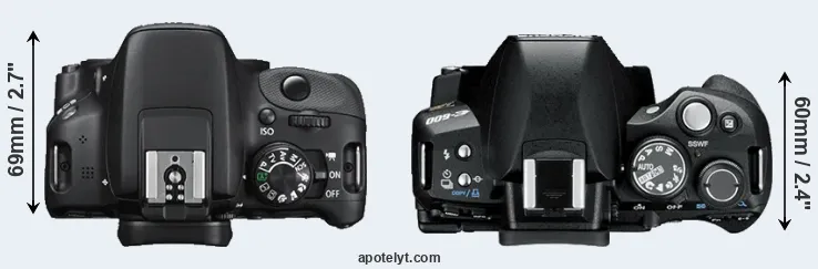 The side-by-side display below illustrates the physical size and weight of the Canon 100D and the Olympus E-600. The two cameras are presented according to their relative size. Three successive views from the front, the top, and the rear are shown. All width, height and depth dimensions are rounded to the nearest millimeter.