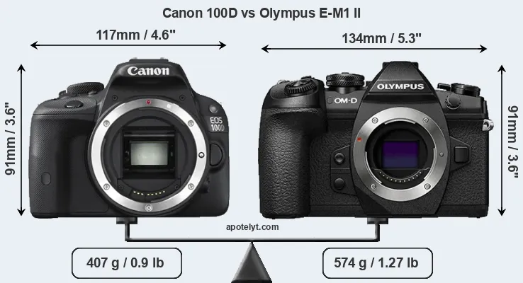 An illustration of the physical size and weight of the Canon 100D and the Olympus E-M1 II is provided in the side-by-side display below. The two cameras are presented according to their relative size. Three successive views from the front, the top, and the rear are shown. All size dimensions are rounded to the nearest millimeter.