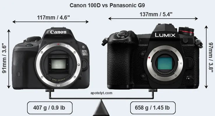 If the front view area (width x height) of the cameras is taken as an aggregate measure of their size, the Panasonic G9 is notably larger (25 percent) than the Canon 100D. Moreover, the G9 is substantially heavier (62 percent) than the 100D. It is noteworthy in this context that the G9 is splash and dust-proof, while the 100D does not feature any corresponding weather-sealing.