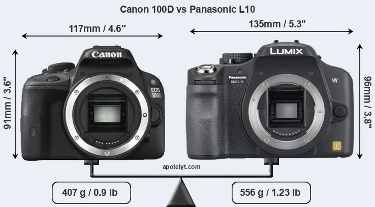 The physical size and weight of the Canon 100D and the Panasonic L10 are illustrated in the side-by-side display below. The two cameras are presented according to their relative size. Three successive views from the front, the top, and the rear are shown. All width, height and depth measures are rounded to the nearest millimeter.