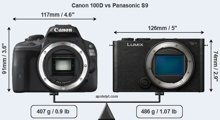 The side-by-side display below illustrates the physical size and weight of the Canon 100D and the Panasonic S9. The two cameras are presented according to their relative size. Three consecutive perspectives from the front, the top, and the back are available. All size dimensions are rounded to the nearest millimeter.
