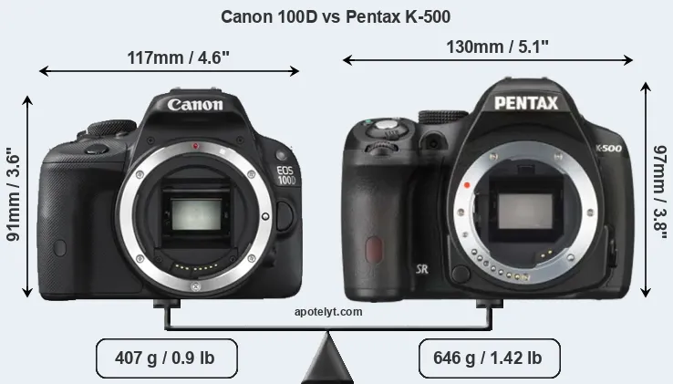 The side-by-side display below illustrates the physical size and weight of the Canon 100D and the Pentax K-500. The two cameras are presented according to their relative size. Three consecutive perspectives from the front, the top, and the back are available. All width, height and depth measures are rounded to the nearest millimeter.
