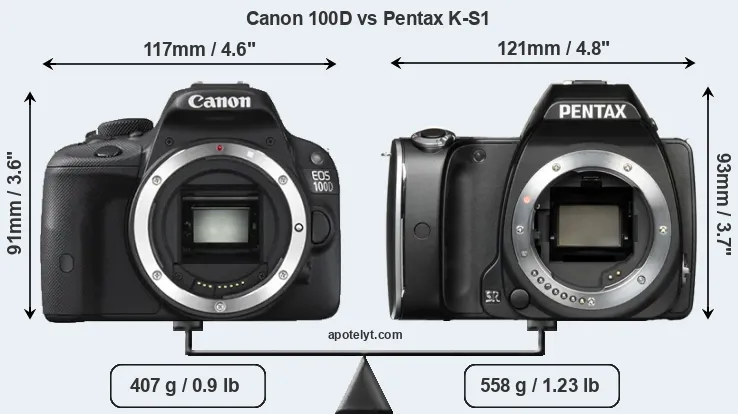 If the front view area (width x height) of the cameras is taken as an aggregate measure of their size, the Pentax K-S1 is notably larger (6 percent) than the Canon 100D. Moreover, the K-S1 is substantially heavier (37 percent) than the 100D. In this context, it is worth noting that neither the 100D nor the K-S1 are weather-sealed.