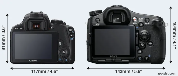 Going beyond this snapshot of core features and characteristics, what are the differences between the Canon EOS 100D and the Sony Alpha SLT-A77? Which one should you buy? Read on to find out how these two cameras compare with respect to their body size, their imaging sensors, their shooting features, their input-output connections, and their reception by expert reviewers.