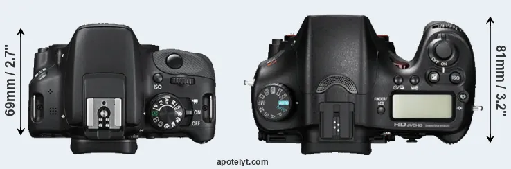 The side-by-side display below illustrates the physical size and weight of the Canon 100D and the Sony A77. The two cameras are presented according to their relative size. Three consecutive perspectives from the front, the top, and the back are available. All size dimensions are rounded to the nearest millimeter.