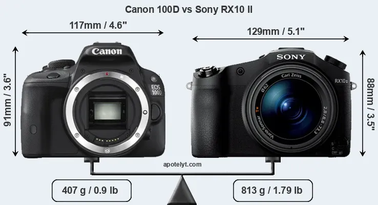 If the front view area (width x height) of the cameras is taken as an aggregate measure of their size, the Sony RX10 II is notably larger (7 percent) than the Canon 100D. It is noteworthy in this context that the RX10 II is splash and dust-proof, while the 100D does not feature any corresponding weather-sealing.