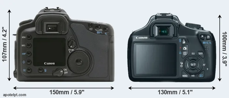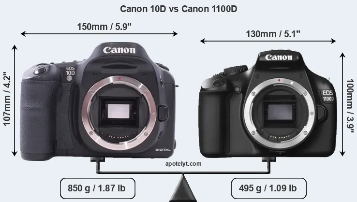 The physical size and weight of the Canon 10D and the Canon 1100D are illustrated in the side-by-side display below. The two cameras are presented according to their relative size. Three consecutive perspectives from the front, the top, and the back are available. All size dimensions are rounded to the nearest millimeter.