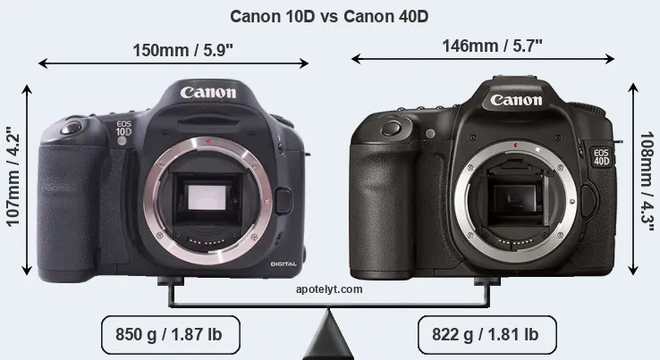 The side-by-side display below illustrates the physical size and weight of the Canon 10D and the Canon 40D. The two cameras are presented according to their relative size. Three consecutive perspectives from the front, the top, and the back are available. All size dimensions are rounded to the nearest millimeter.