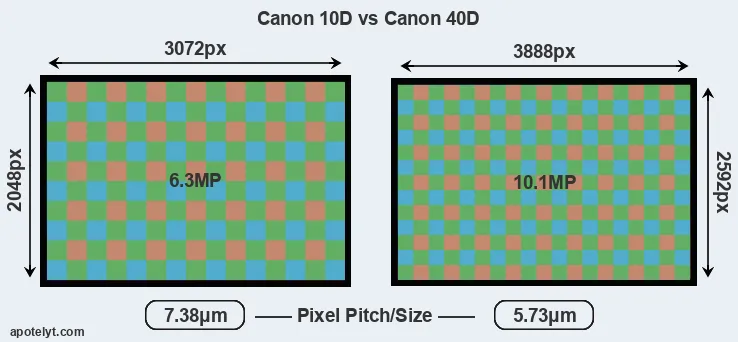 Despite having a slightly smaller sensor, the 40D offers a higher resolution of 10.1 megapixels, compared with 6.3 MP of the 10D. This megapixels advantage comes at the cost of a higher pixel density and a smaller size of the individual pixel (with a pixel pitch of 5.73μm versus 7.38μm for the 10D). However, it should be noted that the 40D is much more recent (by 4 years and 5 months) than the 10D, and its sensor will have benefitted from technological advances during this time that make it possible to gather light more efficiently.