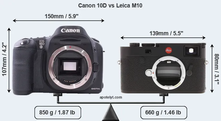 If the front view area (width x height) of the cameras is taken as an aggregate measure of their size, the Leica M10 is considerably smaller (31 percent) than the Canon 10D. Moreover, the M10 is markedly lighter (22 percent) than the 10D. It is noteworthy in this context that the M10 is splash and dust-proof, while the 10D does not feature any corresponding weather-sealing.