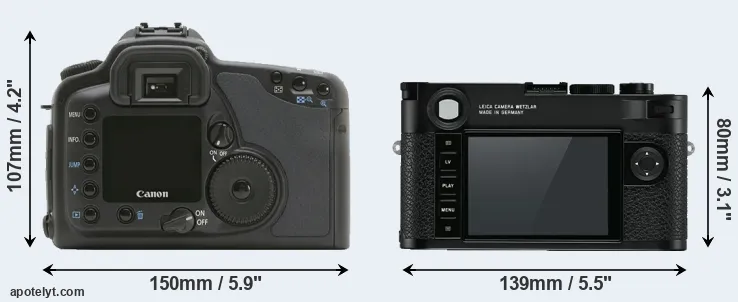 Going beyond this snapshot of core features and characteristics, what are the differences between the Canon EOS 10D and the Leica M10 (Typ 3656)? Which one should you buy? Read on to find out how these two cameras compare with respect to their body size, their imaging sensors, their shooting features, their input-output connections, and their reception by expert reviewers.