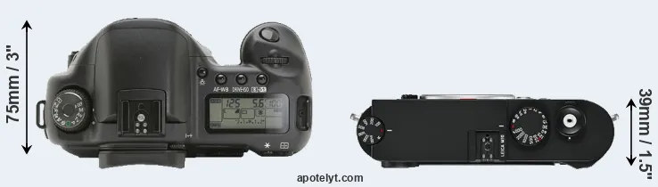 An illustration of the physical size and weight of the Canon 10D and the Leica M10 is provided in the side-by-side display below. The two cameras are presented according to their relative size. Three consecutive views from the front, the top, and the rear side are shown. All width, height and depth measures are rounded to the nearest millimeter.