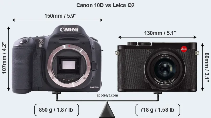 An illustration of the physical size and weight of the Canon 10D and the Leica Q2 is provided in the side-by-side display below. The two cameras are presented according to their relative size. Three consecutive perspectives from the front, the top, and the back are available. All size dimensions are rounded to the nearest millimeter.