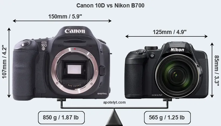 An illustration of the physical size and weight of the Canon 10D and the Nikon B700 is provided in the side-by-side display below. The two cameras are presented according to their relative size. Three consecutive views from the front, the top, and the rear side are shown. All width, height and depth measures are rounded to the nearest millimeter.