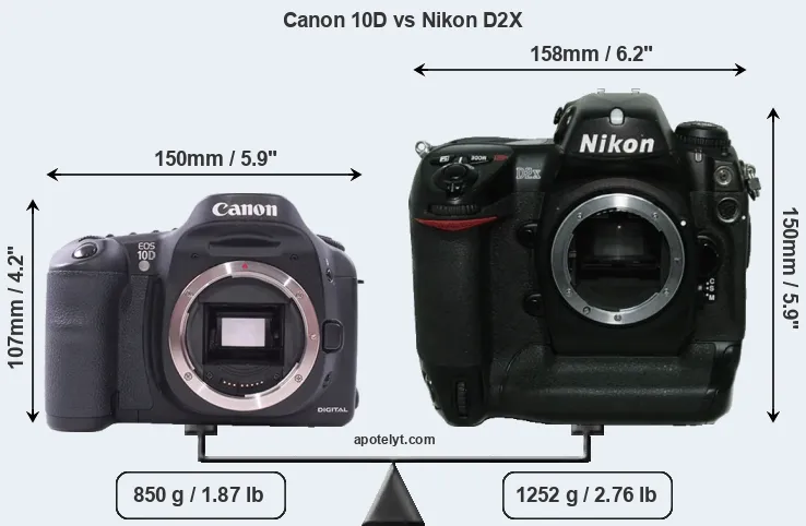 If the front view area (width x height) of the cameras is taken as an aggregate measure of their size, the Nikon D2X is considerably larger (48 percent) than the Canon 10D. Moreover, the D2X is substantially heavier (47 percent) than the 10D. It is noteworthy in this context that the D2X is splash and dust-proof, while the 10D does not feature any corresponding weather-sealing.