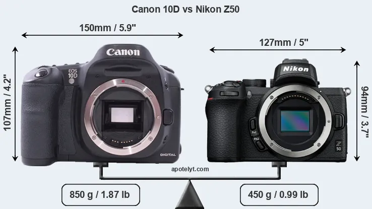 An illustration of the physical size and weight of the Canon 10D and the Nikon Z50 is provided in the side-by-side display below. The two cameras are presented according to their relative size. Three consecutive perspectives from the front, the top, and the back are available. All size dimensions are rounded to the nearest millimeter.
