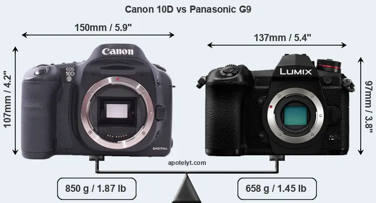 If the front view area (width x height) of the cameras is taken as an aggregate measure of their size, the Panasonic G9 is notably smaller (17 percent) than the Canon 10D. Moreover, the G9 is markedly lighter (23 percent) than the 10D. It is noteworthy in this context that the G9 is splash and dust-proof, while the 10D does not feature any corresponding weather-sealing.