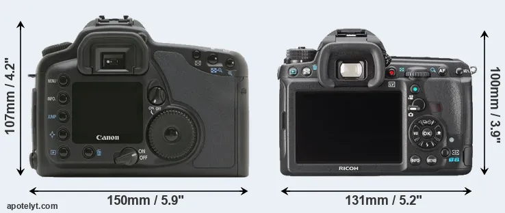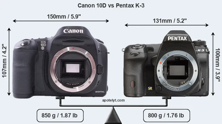 The side-by-side display below illustrates the physical size and weight of the Canon 10D and the Pentax K-3. The two cameras are presented according to their relative size. Three consecutive views from the front, the top, and the rear side are shown. All width, height and depth dimensions are rounded to the nearest millimeter.