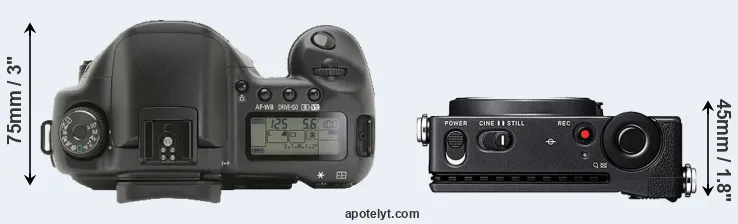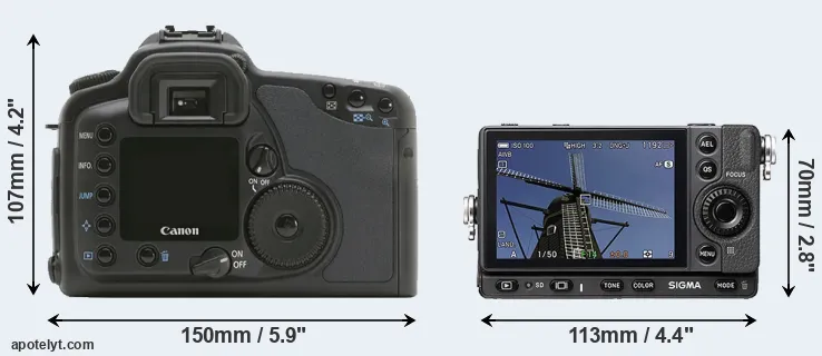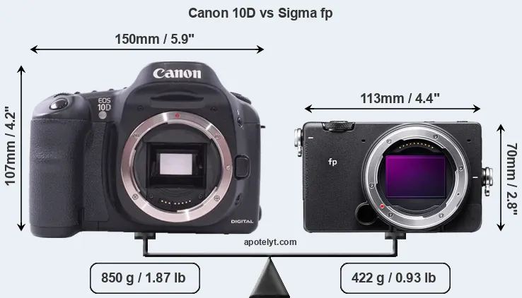 The physical size and weight of the Canon 10D and the Sigma fp are illustrated in the side-by-side display below. The two cameras are presented according to their relative size. Three consecutive perspectives from the front, the top, and the back are available. All width, height and depth dimensions are rounded to the nearest millimeter.